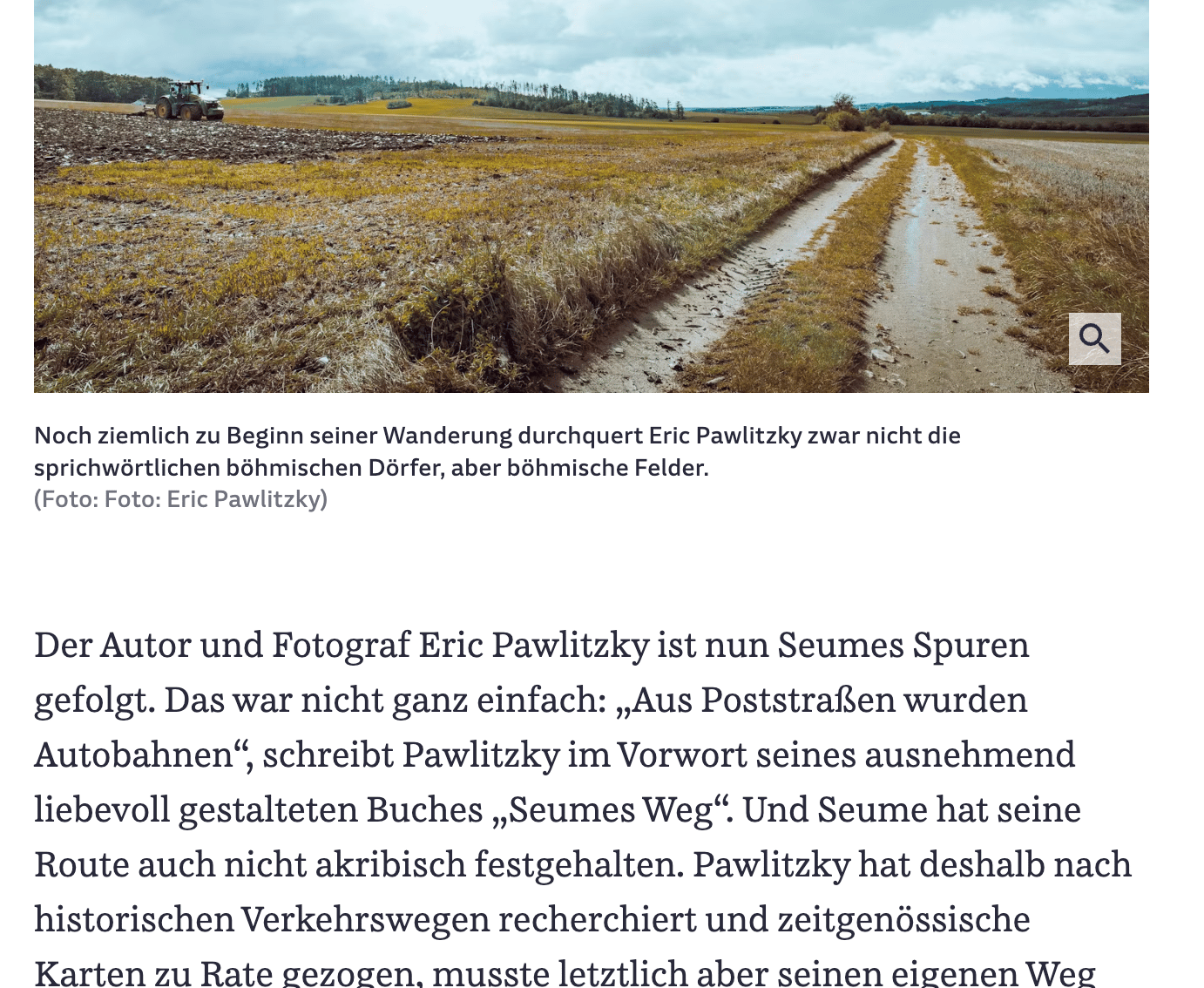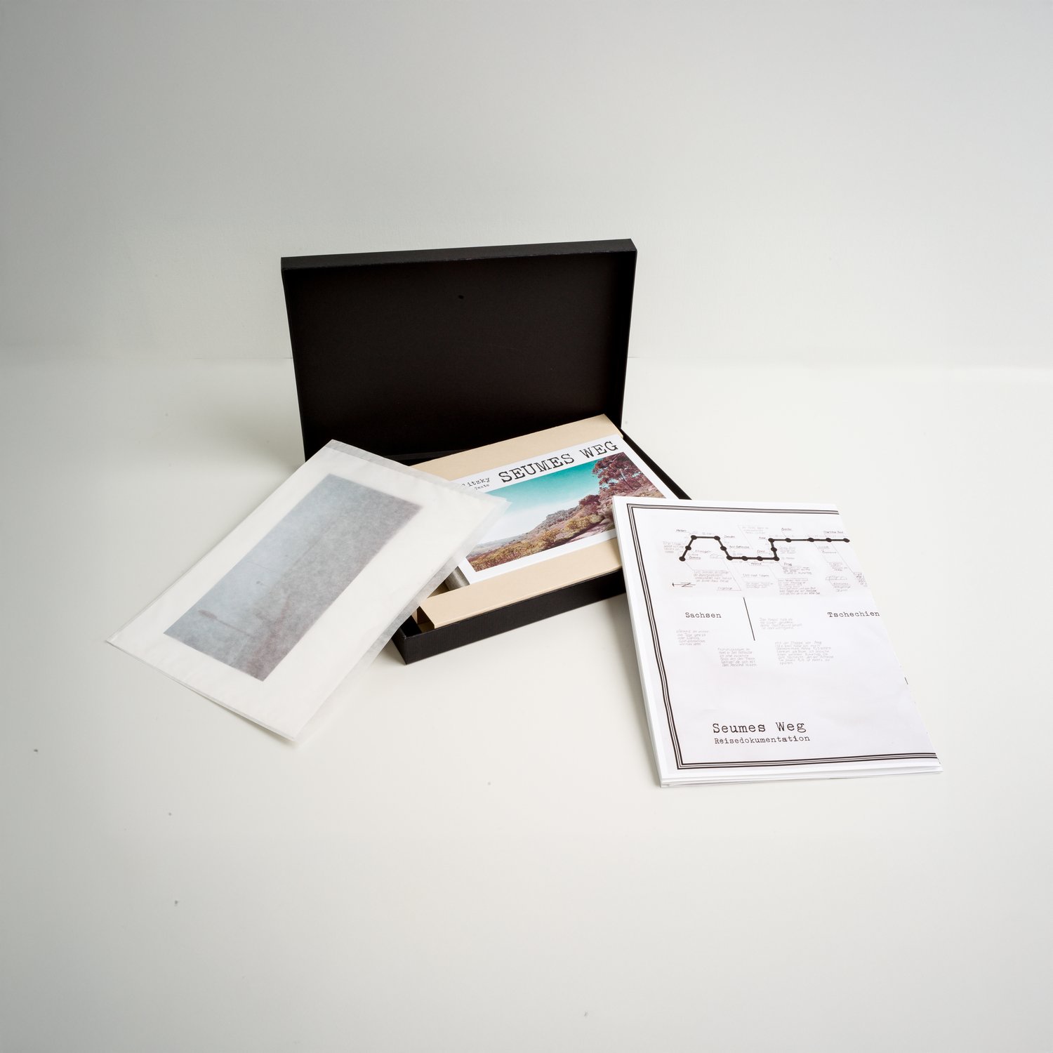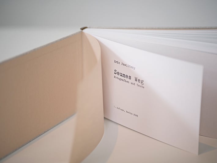 In SEUMES WEG reflektiert der Fotograf und Autor Eric Pawlitzky eine historische Wanderung über 2.160 km. Inspiriert wurde das Projekt durch Johann Gottfried Seumes Buch „Spaziergang nach Syrakus im Jahre 1802“. Damals reiste der sächsische Autor weitgehend zu Fuß von Grimma (südlich von Leipzig) bis ins sizilianische Syrakus. Eric Pawlitzky hat die damalige Reiseroute rekonstruiert und war drei Monate wandernd unterwegs. Er ging der Frage nach, was Seume heute gesehen hätte, und wie er das gegenwärtige Europa wahrgenommen hätte. In 95 farbigen Fotografien versucht er eine Rekonstruktion von Seumes Sehen. Zu jeder Fotografie hat er einen kurzen lyrischen Text verfasst, der die innere Welt des Autors während der Reise beschreibt. Das Buch meidet die verbreitete nüchterne Ästhetik von Bildbänden. Es handelt sich vielmehr um die Reproduktion des Arbeitsdummys des Autors, wodurch Spuren des Entstehungsprozesses in einer archivartigen Anmutung sichtbar werden.