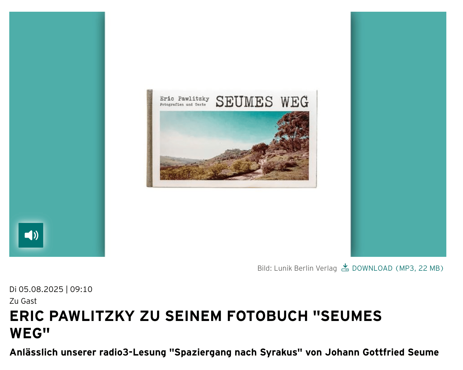 „Im Dezember 1801 trat der Leipziger Schriftsteller Johann Gottfried Seume seinen berühmten „Spaziergang nach Syrakus“ an. Ich habe 2022 versucht, seine Route zu rekonstruieren, der Strecke tatsächlich am Stück zu folgen, und das weitgehend zu Fuß.